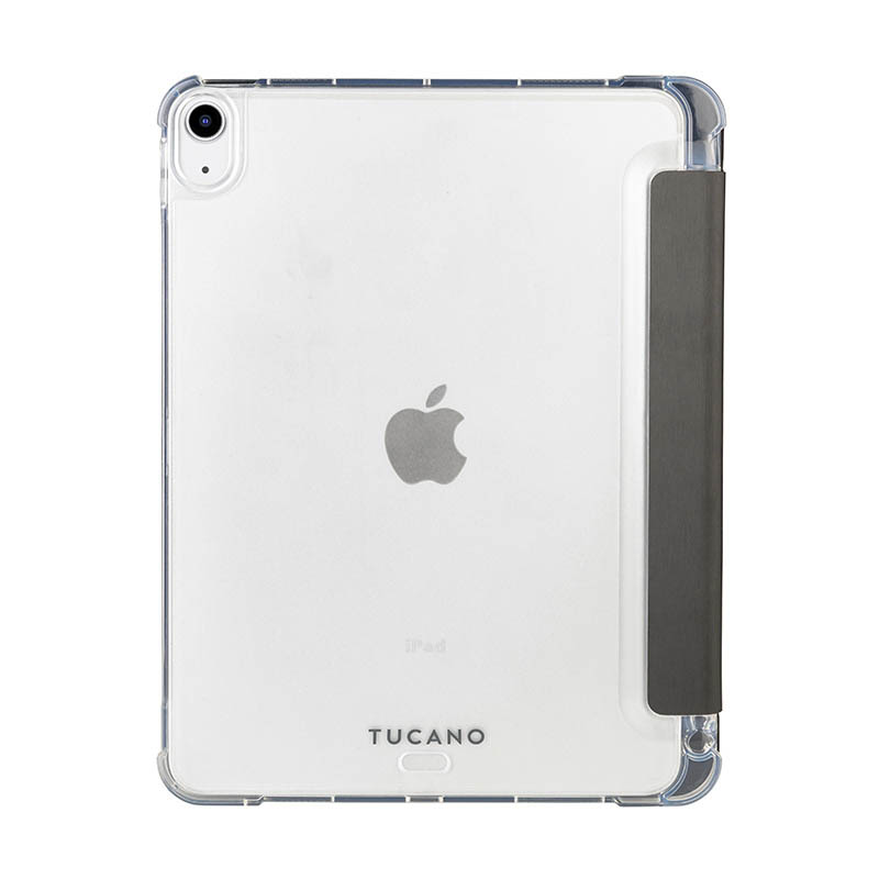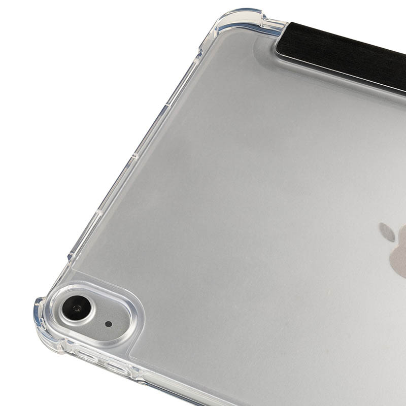 Funda ultraprotectora para el nuevo iPad 11" (2025) / iPad 10.9" (2022), parte de la cual está hecha de plástico reciclado. La cubierta frontal presenta un material de efecto satinado y se convierte en un cómodo soporte. La carcasa trasera antichoque está fabricada en policarbonato transparente de doble inyección con borde de TPU para facilitar la inserción del iPad. La cubierta satinada tiene un compartimento interno para guardar el Apple Pencil y un soporte externo para cargarlo. Aprobado por las pruebas del estándar militar.