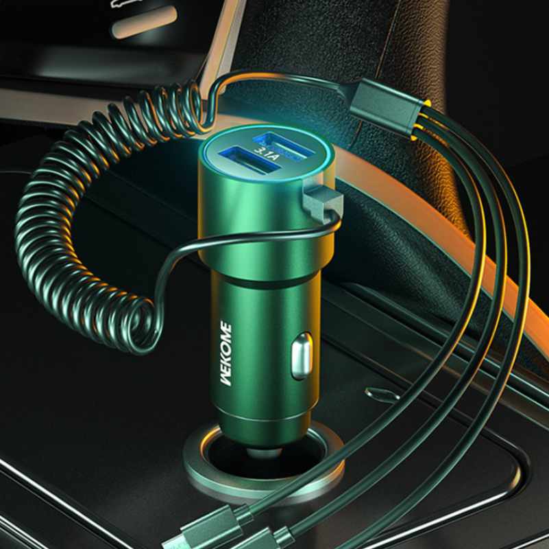 The WEKOME WP-C44 Pop Digital Series is a car charger that will revolutionise the way you connect and charge your devices in your vehicle. This innovative car charger features a built-in 3-in-1 cable supporting USB-C, Lightning and Micro USB, and two additional USB-A ports with a maximum power output of 33W. The WEKOME charger provides a versatile solution for powering electronic devices in your car. The WP-C44 Pop Digital is designed with surge and overheating protection in mind, so you can enjoy fast and safe charging on the go, no matter what your device is. Product features: - Material: PC + aluminium alloy - Input: DC12-24V - Total output power: 33W - Output voltage 2x USB-A: 5V=2.4A - Output voltage: USB-C cable: 5V-3A / 9V-2A / 12V-1.5A 18W - Output voltage: Lightning cable: 5V-2A - Output voltage: Micro USB cable: 5V-2A - Product dimensions: 25x25x60mm - Product weight: 60g