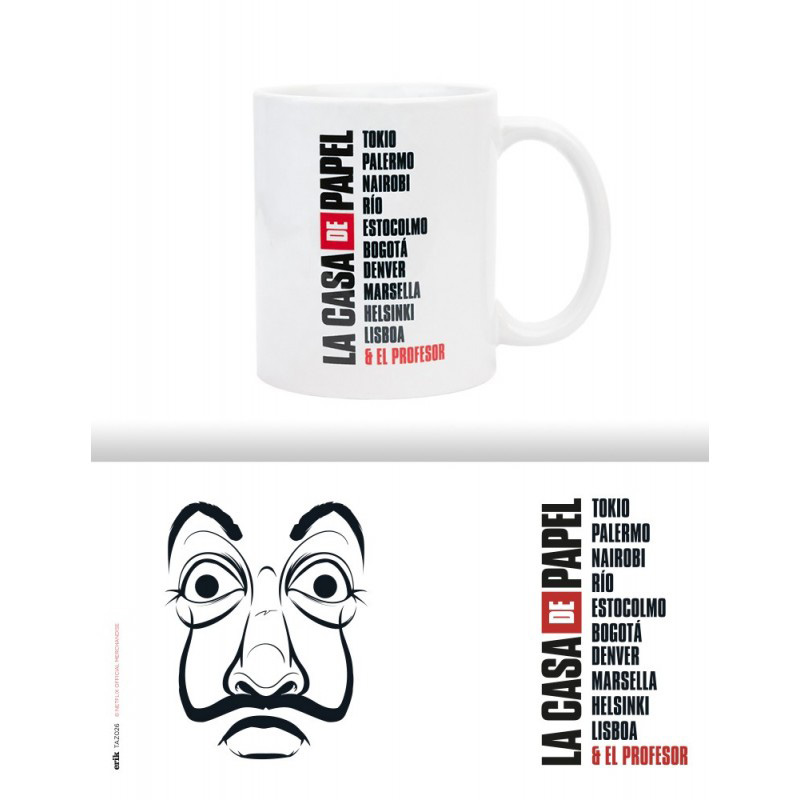 Enter a world full of intrigue and suspense with a mug inspired by the iconic series 'House of Paper'. This stylish 330ml ceramic mug is the perfect accessory for any fan of this Spanish production, showcasing Salvador Dali's distinctive mask, which has become a well-known symbol of rebellion in the series.