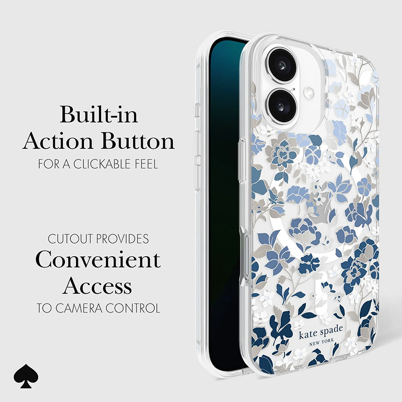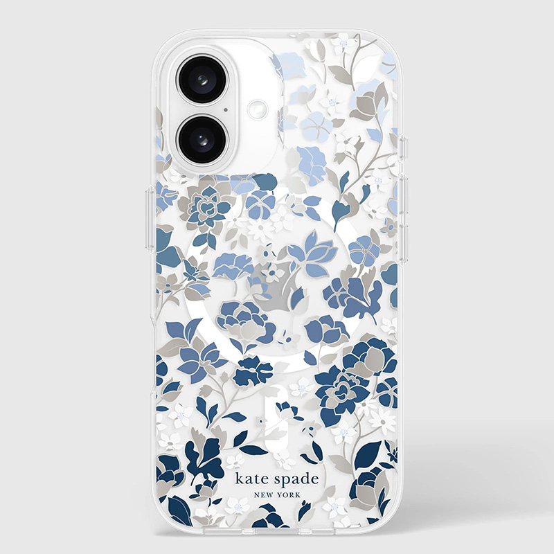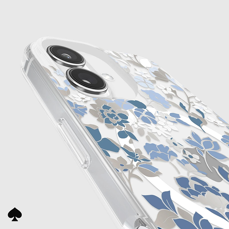 Eleganckie i smukłe etui ochronne Kate Spade New York Protective Gems MagSafe do iPhone 16 z motywem kwiatowym Flowerbed Blue urzeka wyrafinowanym designem, łącząc styl z luksusem.