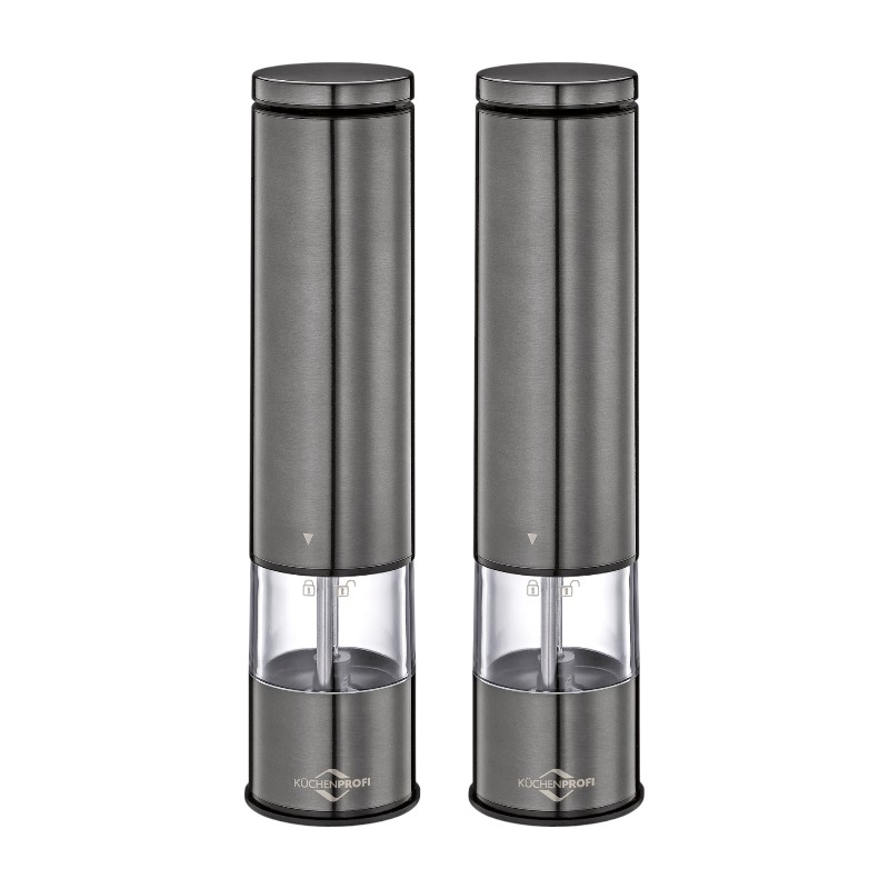 | Název položky | Küchenprofi Boston – Elektrické mlýnky na sůl a pepř s keramickým mlecím mechanismem 23×5 cm, 2 ks (šedé) |
