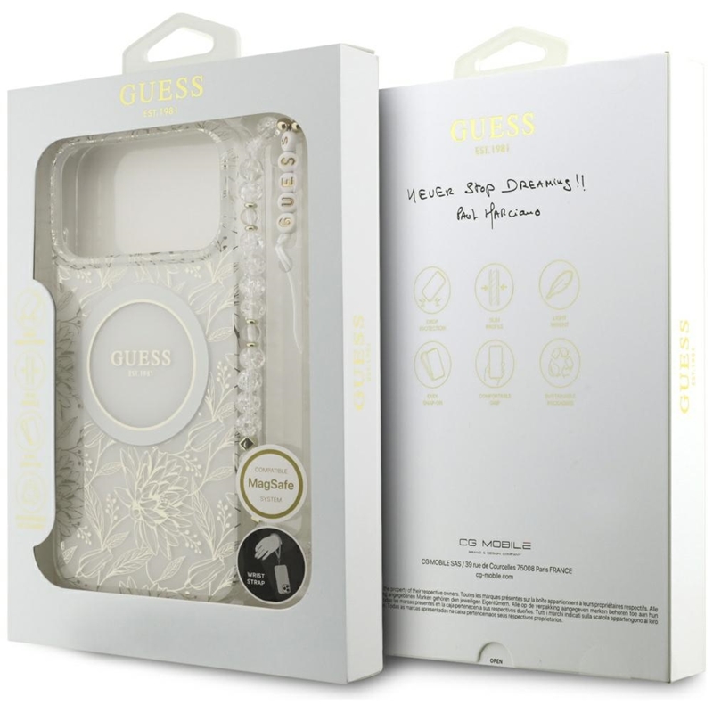 Guess IML Flowers Electro Pearl Strap MagSafe - Etui iPhone 17 Pro Max (biały)