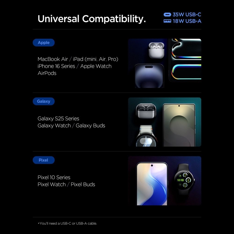 · USB-C: 5V/3A, 9V/3A, 12V/2.92A, 15V/2.33A, 20V/1.75A PPS: 5V–11V/3A (35W Max)