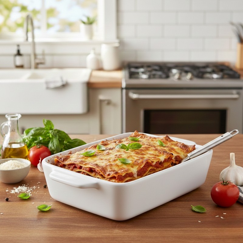 • Rechteckige Form: Ideal für Aufläufe, Lasagne, Fleisch und Gemüse.